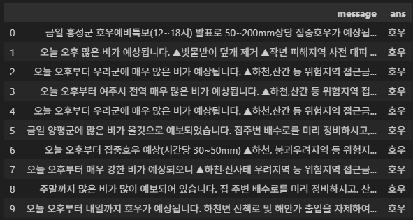 모든 종류의 재난문자를 크롤링했고, 호우에 의한 재난문자만 추출하고자 합니다.