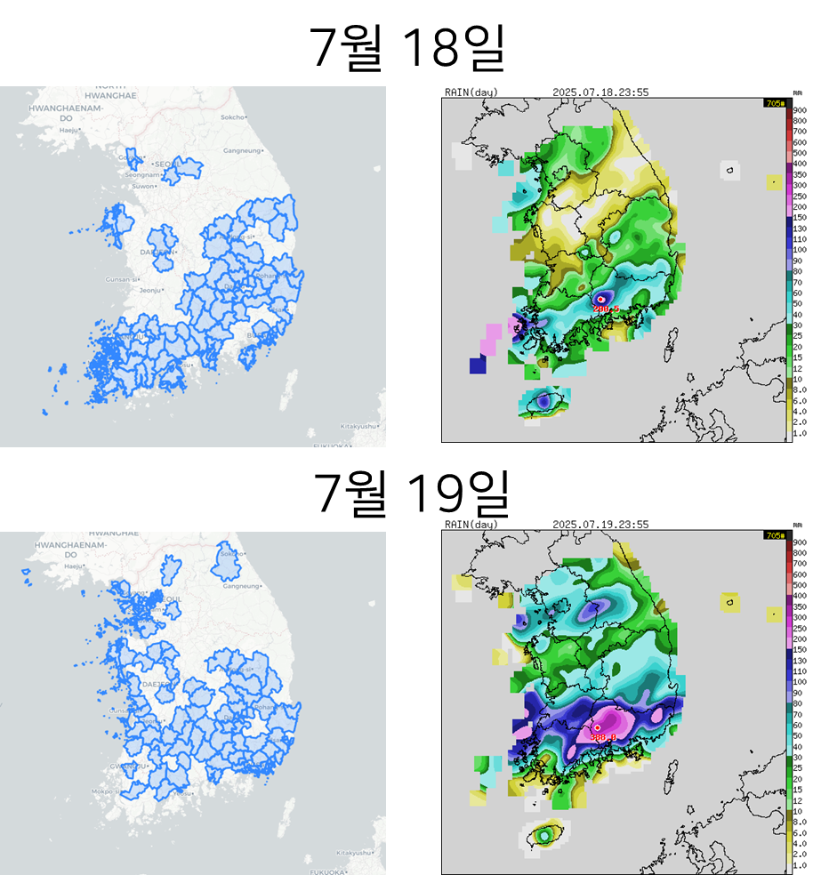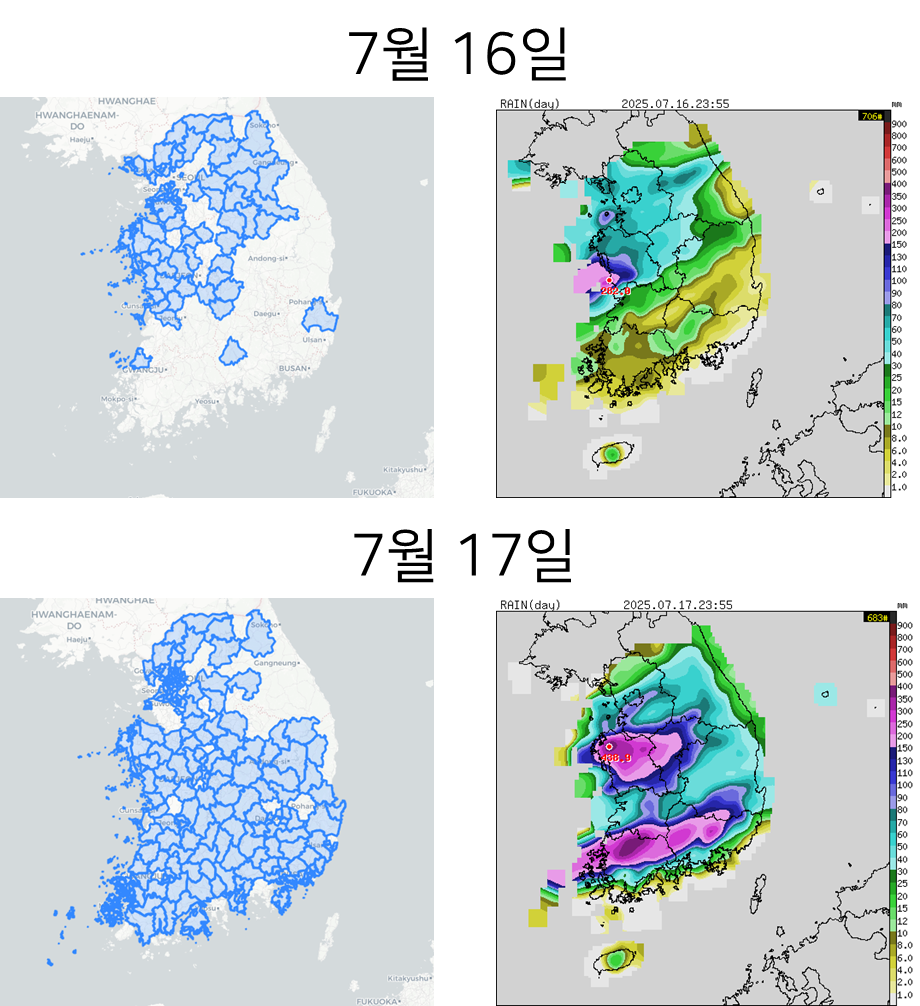 2025년 7월 16일 ~ 19일, 중부지방과 남부지방에 많은 비가 내렸습니다.