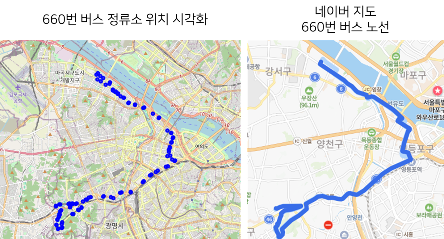 제가 그린 660번 경유 버스 정류소 위치에 네이버 지도의 660번 버스 노선을 비교하면 잘 그린 것 같습니다.